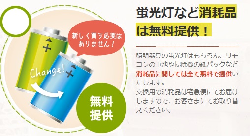 照明器具の蛍光灯はもちろん、リモコンの電池や掃除機の紙パックなど消耗品に関しては全て無料で提供いたします。 交換用の消耗品は宅急便にてお届けしますので、お客さまにてお取り替えください。