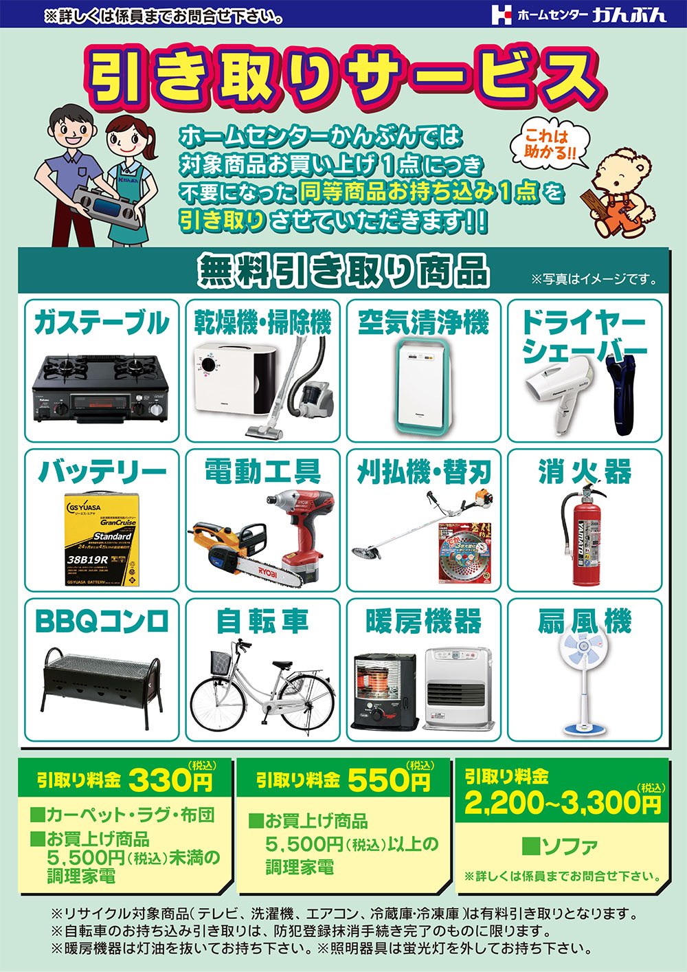 ホームセンターかんぶんでは対象商品お買い上げ1点につき、不要になった同等商品お持ち込み1点を無料でお引き取りしております。無料対象はガステーブル、乾燥機・掃除機、空気清浄機、ドライヤー・シェイバー、バッテリー、電動工具、刈払機・替刃、消火器、BBQコンロ、自転車、暖房器具、扇風機。そのほかの商品の場合は引き取り料金が発生します。
