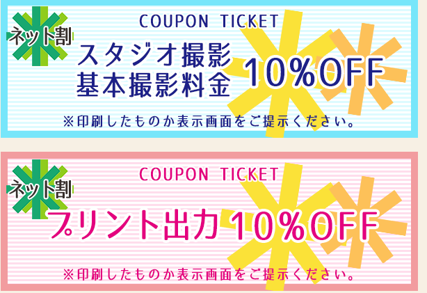 『スタジオ撮影』及び『プリント出力』が10%OFFでご利用いただけます。